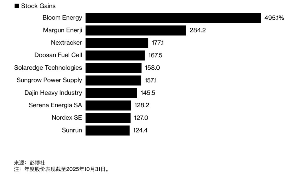 在这场行情中,燃料电池制造商Bloom Energy成为最大赢家。今年以来,公司股价上涨近500%,领涨标普清洁能源转型指数。