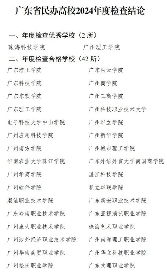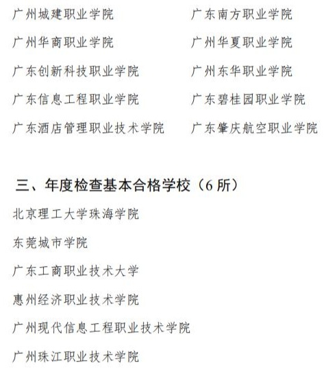 其中,年度检查结论“优秀”的学校为珠海科技学院、广州理工学院;年度检查结论“合格”的学校有42所;年度检查结论“基本合格”的学校有6所。