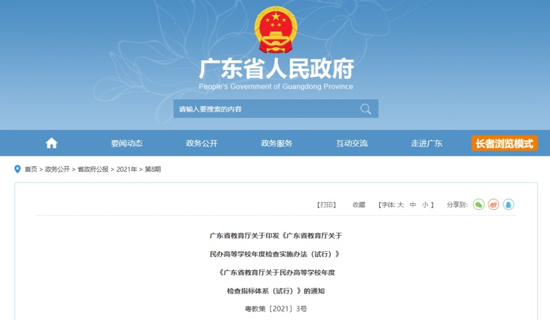 2021年3月,《广东省教育厅关于民办高等学校年度检查实施办法(试行)》《广东省教育厅关于民办高等学校年度检查指标体系(试行)》印发。其中明确规定: