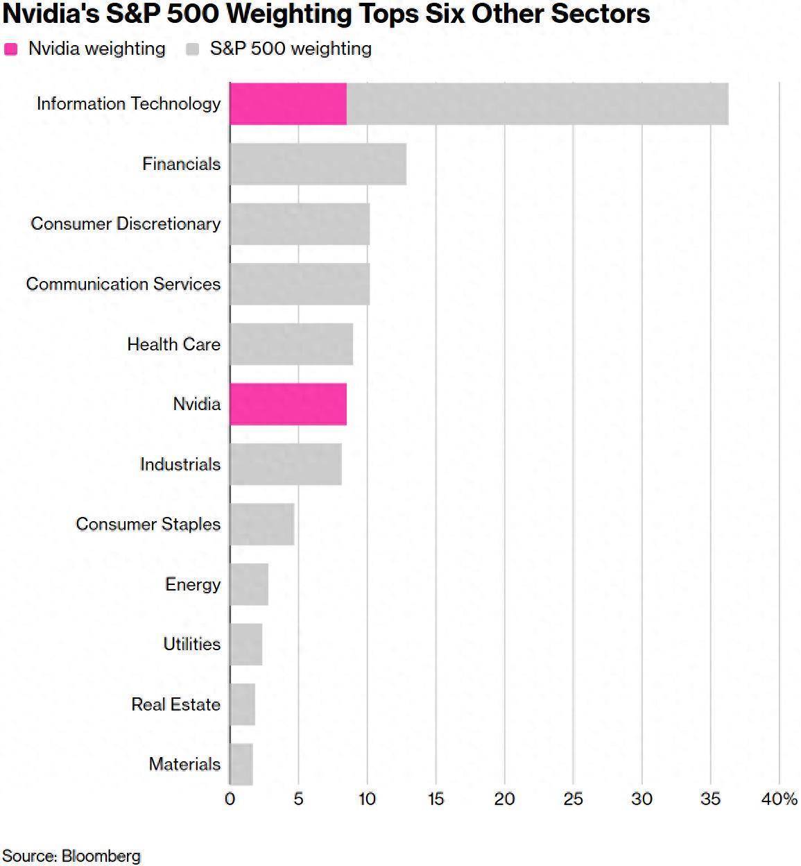 作为全球最大企业,英伟达在按市值加权的主要股指中自然占据最高权重。该股在标普500指数中占比达8.5%,超过该指数底部240家公司的权重总和。