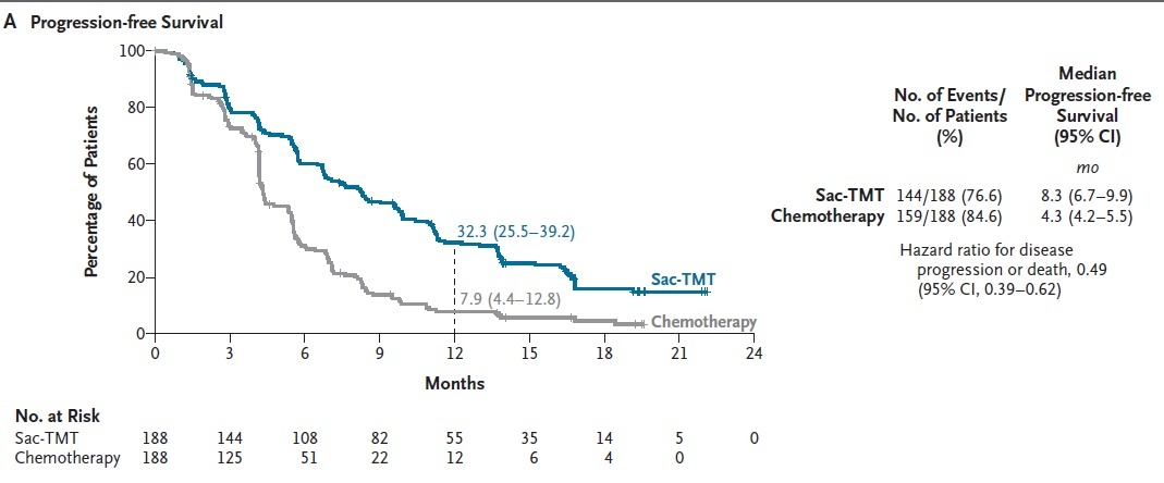 无进展生存期方面,芦康沙妥珠单抗组中位PFS达8.3个月,显著优于化疗组的4.3个月(HR=0.49,95%CI: 0.39–0.62,P<0.0001),疾病进展或死亡风险降低51%,成为全球首个TROP2 ADC单药治疗该人群实现PFS显著获益的III期研究。