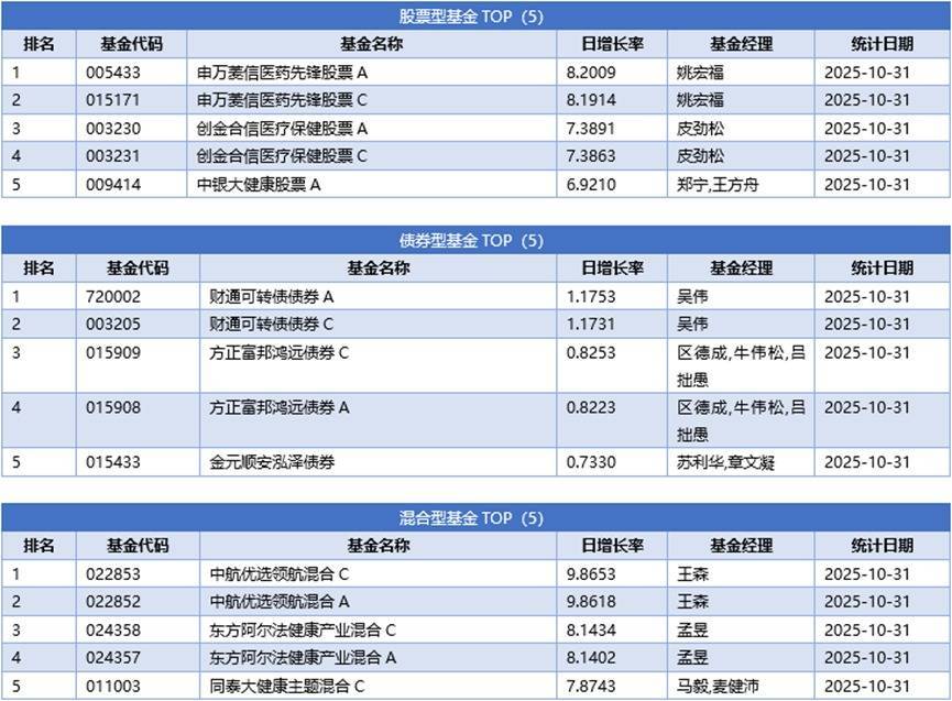 单基金方面,剔除掉 创新封基类型 基金的影响,10月31日业绩表现最好的基金为中航优选领航混合C,日增长率为9.8653%,其次为中航优选领航混合A,日增长率为9.8618%、申万菱信医药先锋股票A,日增长率为8.2009%。
